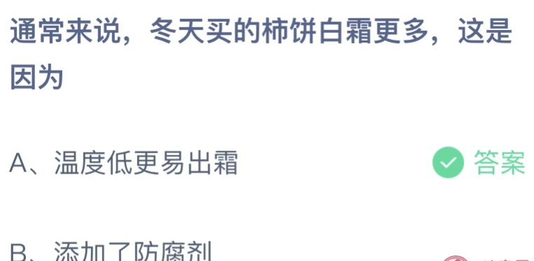 通常来说,冬天买的柿饼白霜更多这是因为什么呢?这道题目是蚂蚁庄园小课堂11月10日的问答题,下面、小编带来:蚂蚁庄园11月10日“冬天买的柿饼白霜更多的原因”的答案介绍。